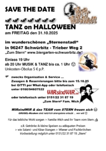 https://biergarten-schwuerbitz.de/wp-content/uploads/2020/04/biergarten-zum-stern-674x630.jpg00Tamara Wichhttps://biergarten-schwuerbitz.de/wp-content/uploads/2020/04/biergarten-zum-stern-674x630.jpgTamara Wich2025-10-06 10:03:212025-10-06 10:03:21Freitag, 31.10.2025: Tanz mit WIR sind WIR